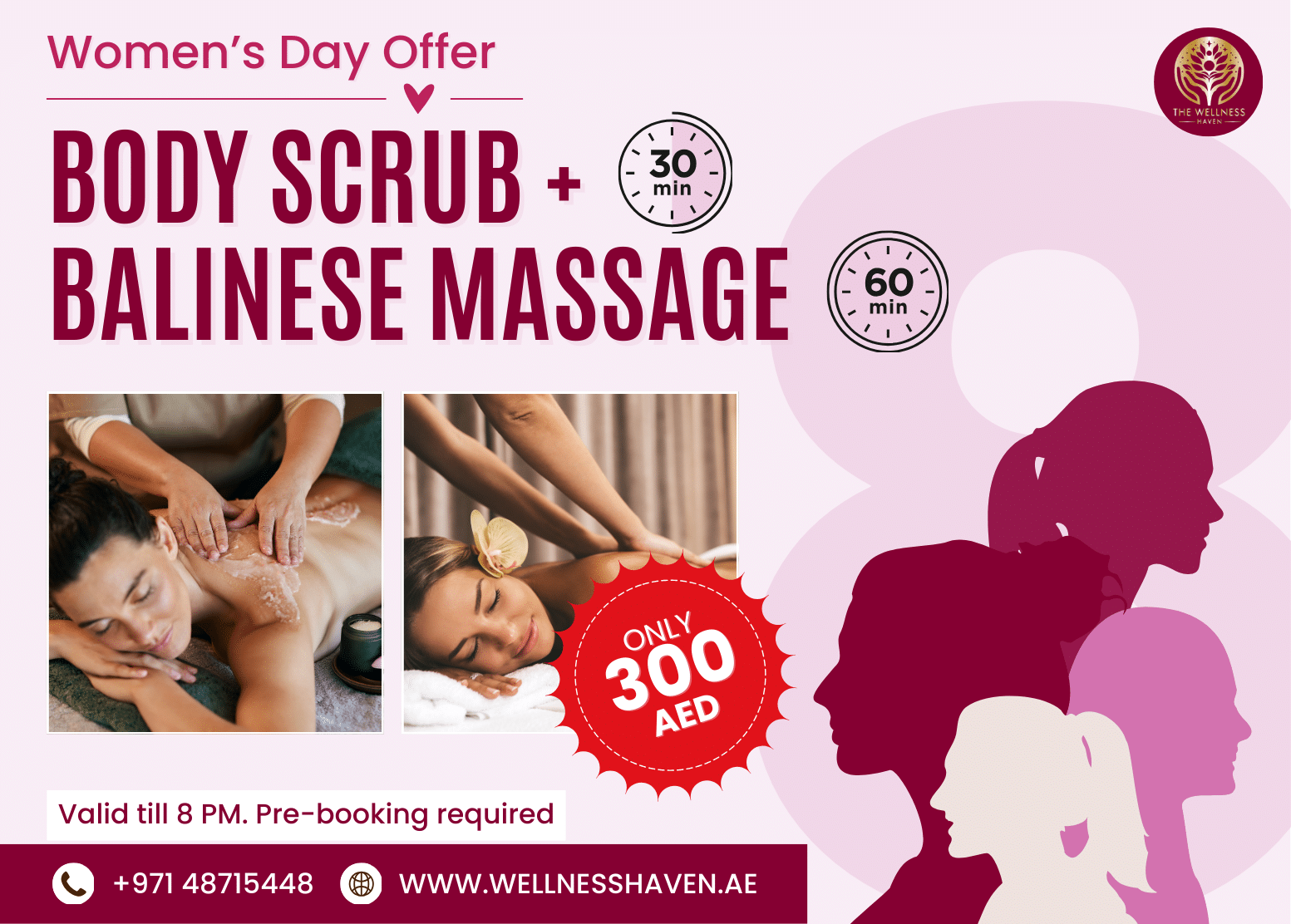 Celebrate Women’s Day with a truly relaxing and rejuvenating spa escape designed especially for you. The experience begins with a gentle 30-minute body scrub that exfoliates dead skin, improves texture, and leaves your skin feeling soft, smooth, and radiant. This is followed by a 60-minute Balinese massage using flowing techniques and soothing pressure to release muscle tension, improve circulation, and calm the mind. Perfect for relieving stress and restoring balance, this indulgent treatment leaves you feeling refreshed, renewed, and beautifully relaxed.